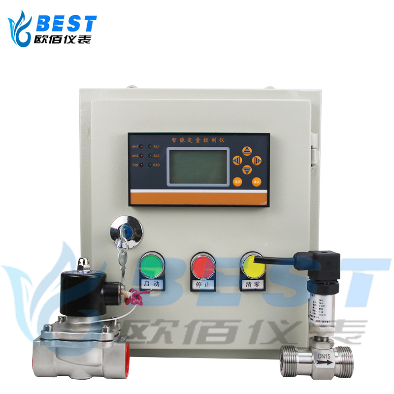 將儀表常數(shù)置入控制儀內(nèi),控制儀根據(jù)設(shè)定值自動(dòng)計(jì)算出其對(duì)應(yīng)的脈沖數(shù),流量定量控制儀啟動(dòng)時(shí)改變內(nèi)置的繼電器狀態(tài),使得控制閥開(kāi)啟,控制儀對(duì)來(lái)自流量傳感器的信號(hào)進(jìn)行計(jì)數(shù),到達(dá)設(shè)定量時(shí)恢復(fù)繼電器的原始狀態(tài),控制閥將關(guān)閉,從而實(shí)現(xiàn)對(duì)管道內(nèi)流量的定量控制。